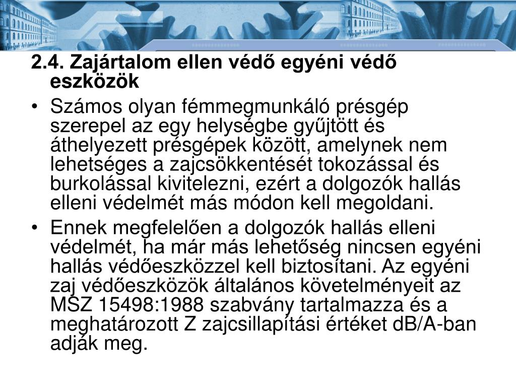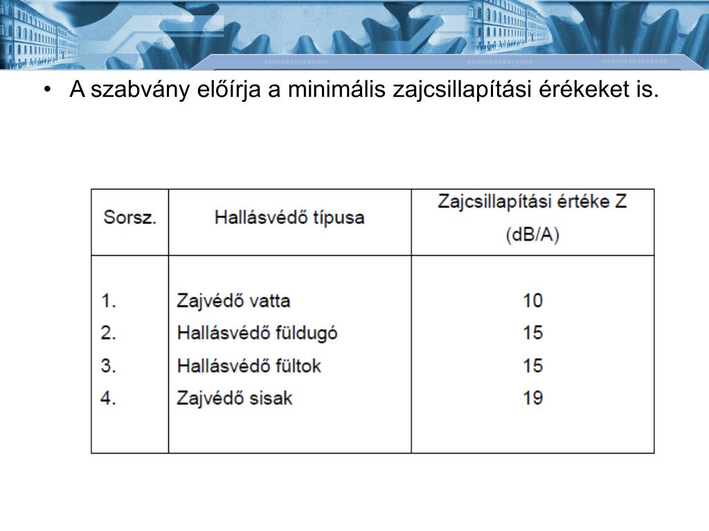 2.4. Zajártalom ellen védő egyéni védő eszközök • Számos olyan fémmegmunkáló présgép szerepel az egy helységbe gyűjtött és áthelyezett présgépek között, amelynek nem lehetséges a zajcsökkentését tokozással és burkolással kivitelezni, ezért a dolgozók hallás elleni védelmét más módon kell megoldani. • Ennek megfelelően a dolgozók hallás elleni védelmét, ha már más lehetőség nincsen egyéni hallás védőeszközzel kell biztosítani. Az egyéni zaj védőeszközök általános követelményeit az MSZ 15498:1988 szabvány tartalmazza és a meghatározott Z zajcsillapítási értéket dB/A-ban adják meg.