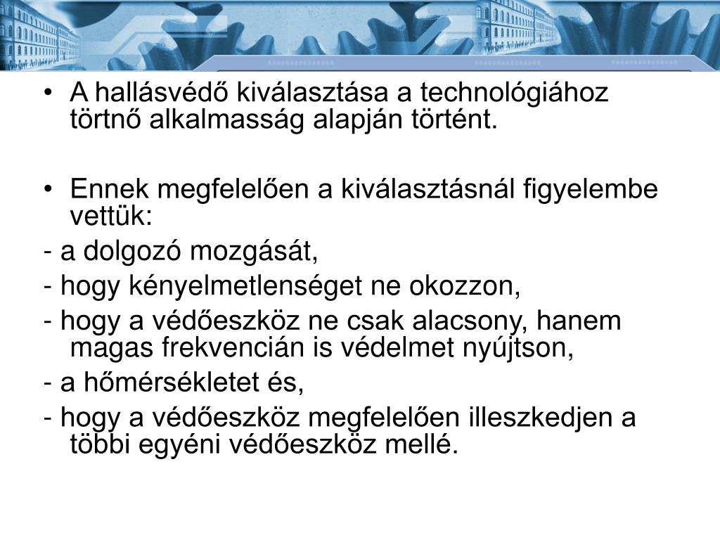 A hallásvédő kiválasztása a technológiához törtnő alkalmasság alapján történt. • Ennek megfelelően a kiválasztásnál figyelembe vettük: - a dolgozó mozgását, - hogy kényelmetlenséget ne okozzon, - hogy a védőeszköz ne csak alacsony, hanem magas frekvencián is védelmet nyújtson, - a hőmérsékletet és, - hogy a védőeszköz megfelelően illeszkedjen a többi egyéni védőeszköz mellé.