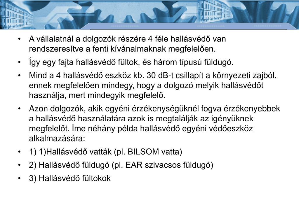 A vállalatnál a dolgozók részére 4 féle hallásvédő van rendszeresítve a fenti kívánalmaknak megfelelően. • Így egy fajta hallásvédő fültok, és három típusú füldugó. • Mind a 4 hallásvédő eszköz kb. 30 dB-t csillapít a környezeti zajból, ennek megfelelően mindegy, hogy a dolgozó melyik hallásvédőt használja, mert mindegyik megfelelő. • Azon dolgozók, akik egyéni érzékenységüknél fogva érzékenyebbek a hallásvédő használatára azok is megtalálják az igényüknek megfelelőt. Íme néhány példa hallásvédő egyéni védőeszköz alkalmazására: • 1) 1)Hallásvédő vatták (pl. BILSOM vatta) • 2) Hallásvédő füldugó (pl. EAR szivacsos füldugó) • 3) Hallásvédő fültokok