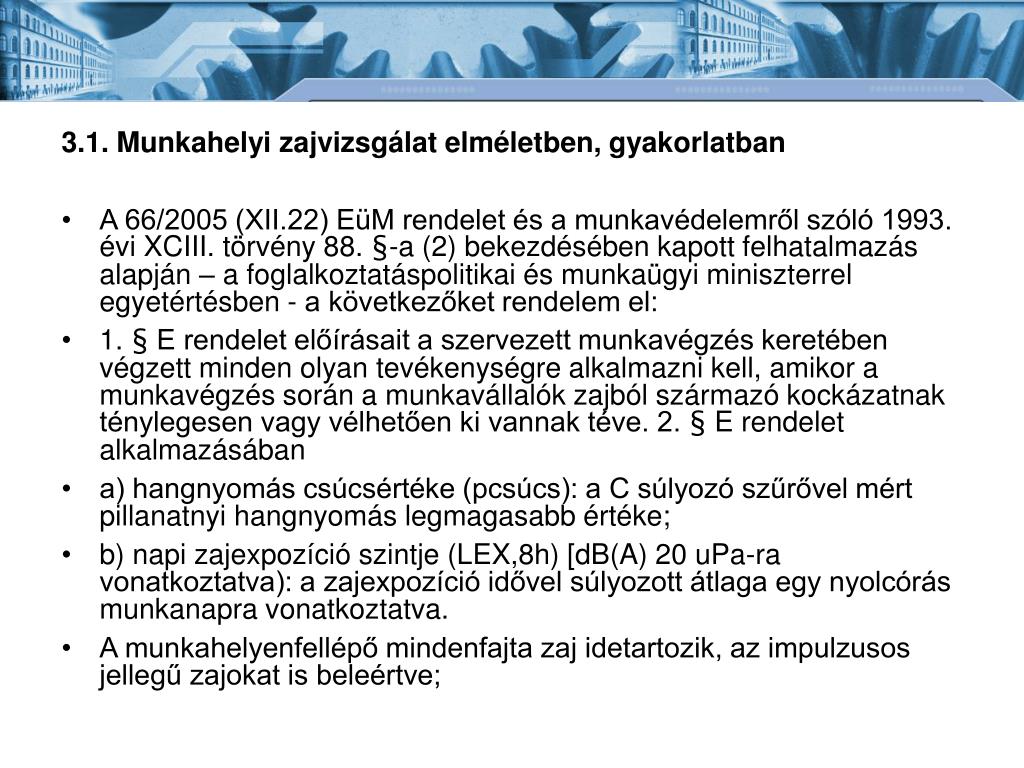 3.1. Munkahelyi zajvizsgálat elméletben, gyakorlatban • A 66/2005 (XII.22) EüM rendelet és a munkavédelemről szóló 1993. évi XCIII. törvény 88. §-a (2) bekezdésében kapott felhatalmazás alapján – a foglalkoztatáspolitikai és munkaügyi miniszterrel egyetértésben - a következőket rendelem el: • 1. § E rendelet előírásait a szervezett munkavégzés keretében végzett minden olyan tevékenységre alkalmazni kell, amikor a munkavégzés során a munkavállalók zajból származó kockázatnak ténylegesen vagy vélhetően ki vannak téve. 2. § E rendelet alkalmazásában • a) hangnyomás csúcsértéke (pcsúcs): a C súlyozó szűrővel mért pillanatnyi hangnyomás legmagasabb értéke; • b) napi zajexpozíció szintje (LEX,8h) [dB(A) 20 uPa-ra vonatkoztatva): a zajexpozíció idővel súlyozott átlaga egy nyolcórás munkanapra vonatkoztatva. • A munkahelyenfellépő mindenfajta zaj idetartozik, az impulzusos jellegű zajokat is beleértve;