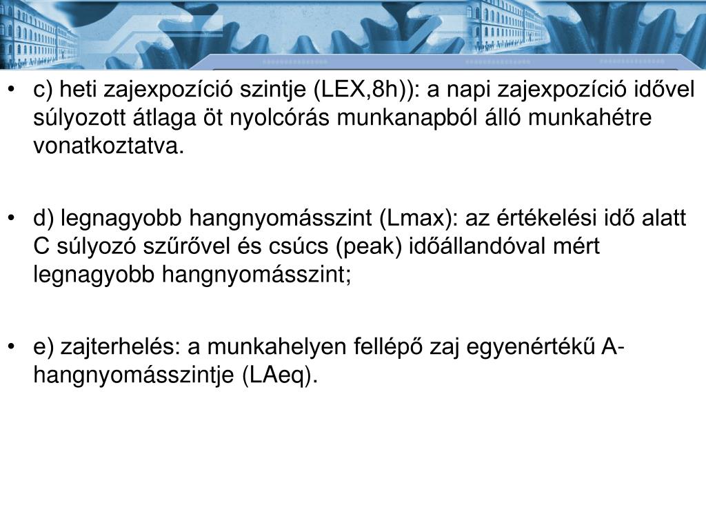 c) heti zajexpozíció szintje (LEX,8h)): a napi zajexpozíció idővel súlyozott átlaga öt nyolcórás munkanapból álló munkahétre vonatkoztatva. • d) legnagyobb hangnyomásszint (Lmax): az értékelési idő alatt C súlyozó szűrővel és csúcs (peak) időállandóval mért legnagyobb hangnyomásszint; • e) zajterhelés: a munkahelyen fellépő zaj egyenértékű A-hangnyomásszintje (LAeq).