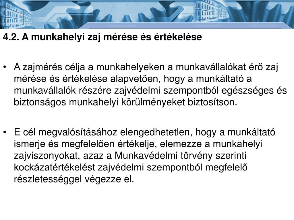 4.2. A munkahelyi zaj mérése és értékelése • A zajmérés célja a munkahelyeken a munkavállalókat érő zaj mérése és értékelése alapvetően, hogy a munkáltató a munkavállalók részére zajvédelmi szempontból egészséges és biztonságos munkahelyi körülményeket biztosítson. • E cél megvalósításához elengedhetetlen, hogy a munkáltató ismerje és megfelelően értékelje, elemezze a munkahelyi zajviszonyokat, azaz a Munkavédelmi törvény szerinti kockázatértékelést zajvédelmi szempontból megfelelő részletességgel végezze el.