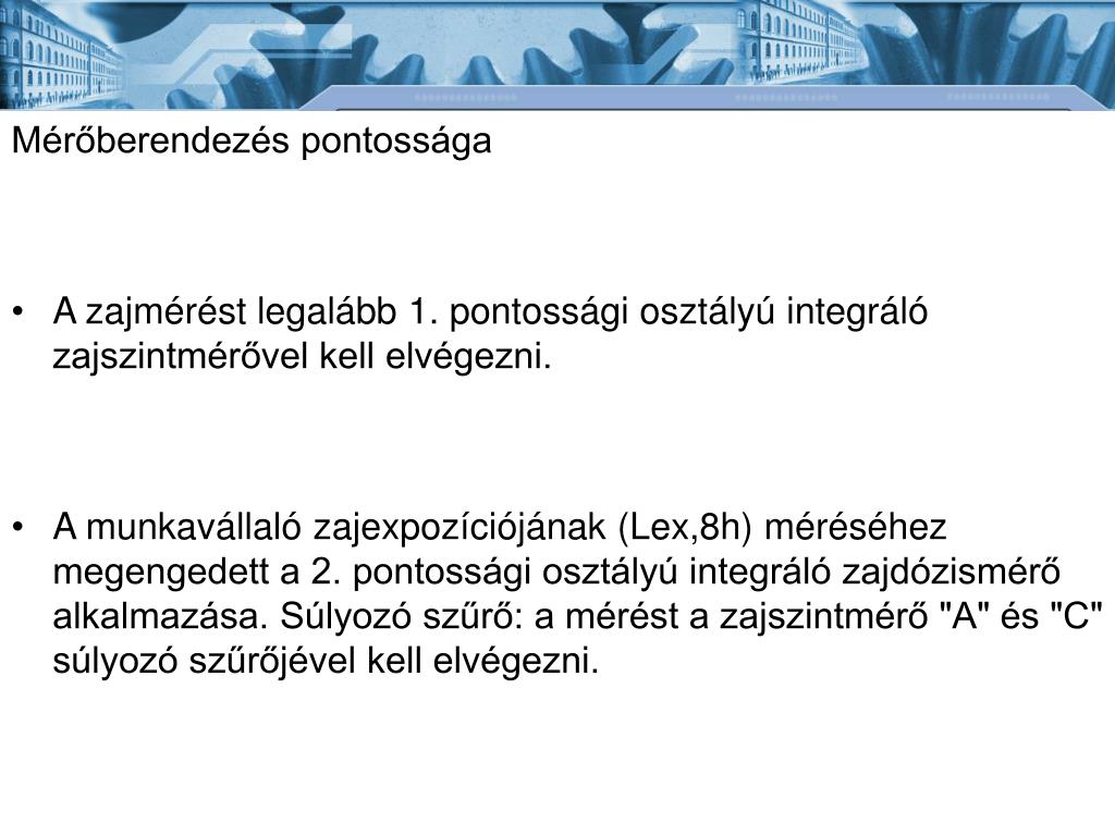 Mérőberendezés pontossága • A zajmérést legalább 1. pontossági osztályú integráló zajszintmérővel kell elvégezni. • A munkavállaló zajexpozíciójának (Lex,8h) méréséhez megengedett a 2. pontossági osztályú integráló zajdózismérő alkalmazása. Súlyozó szűrő: a mérést a zajszintmérő "A" és "C" súlyozó szűrőjével kell elvégezni.