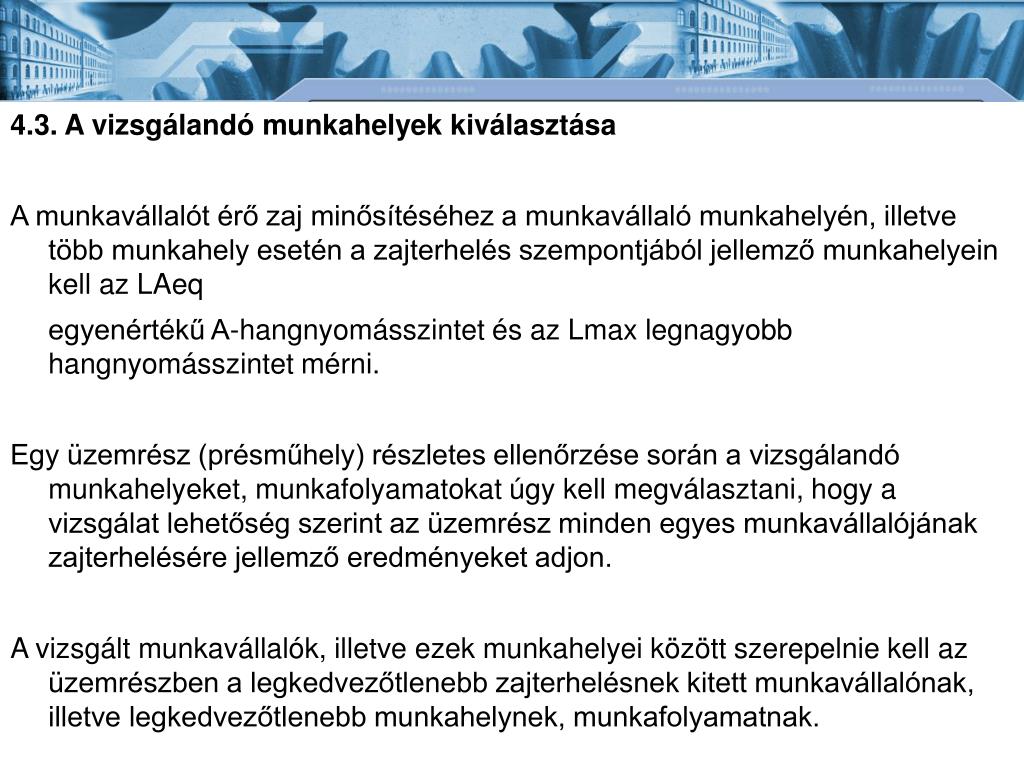 4.3. A vizsgálandó munkahelyek kiválasztása A munkavállalót érő zaj minősítéséhez a munkavállaló munkahelyén, illetve több munkahely esetén a zajterhelés szempontjából jellemző munkahelyein kell az LAeq egyenértékű A-hangnyomásszintet és az Lmax legnagyobb hangnyomásszintet mérni. Egy üzemrész (présműhely) részletes ellenőrzése során a vizsgálandó munkahelyeket, munkafolyamatokat úgy kell megválasztani, hogy a vizsgálat lehetőség szerint az üzemrész minden egyes munkavállalójának zajterhelésére jellemző eredményeket adjon. A vizsgált munkavállalók, illetve ezek munkahelyei között szerepelnie kell az üzemrészben a legkedvezőtlenebb zajterhelésnek kitett munkavállalónak, illetve legkedvezőtlenebb munkahelynek, munkafolyamatnak.