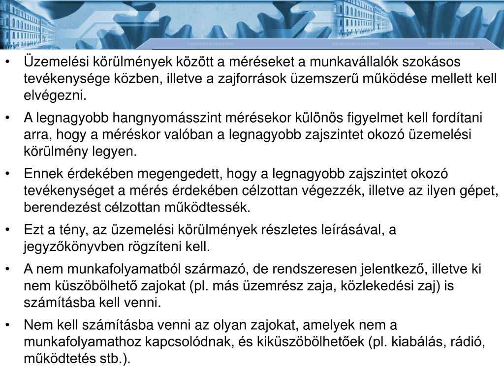 Üzemelési körülmények között a méréseket a munkavállalók szokásos tevékenysége közben, illetve a zajforrások üzemszerű működése mellett kell elvégezni. • A legnagyobb hangnyomásszint mérésekor különös figyelmet kell fordítani arra, hogy a méréskor valóban a legnagyobb zajszintet okozó üzemelési körülmény legyen. • Ennek érdekében megengedett, hogy a legnagyobb zajszintet okozó tevékenységet a mérés érdekében célzottan végezzék, illetve az ilyen gépet, berendezést célzottan működtessék. • Ezt a tény, az üzemelési körülmények részletes leírásával, a jegyzőkönyvben rögzíteni kell. • A nem munkafolyamatból származó, de rendszeresen jelentkező, illetve ki nem küszöbölhető zajokat (pl. más üzemrész zaja, közlekedési zaj) is számításba kell venni. • Nem kell számításba venni az olyan zajokat, amelyek nem a munkafolyamathoz kapcsolódnak, és kiküszöbölhetőek (pl. kiabálás, rádió, működtetés stb.).