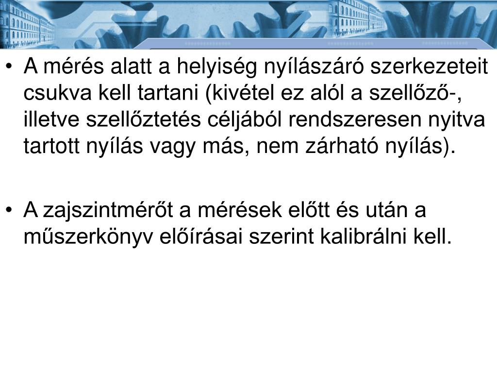 A mérés alatt a helyiség nyílászáró szerkezeteit csukva kell tartani (kivétel ez alól a szellőző-, illetve szellőztetés céljából rendszeresen nyitva tartott nyílás vagy más, nem zárható nyílás). • A zajszintmérőt a mérések előtt és után a műszerkönyv előírásai szerint kalibrálni kell.