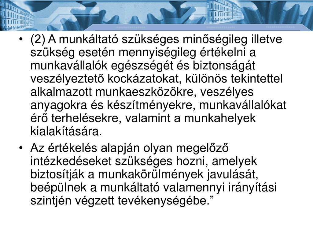 (2) A munkáltató szükséges minőségileg illetve szükség esetén mennyiségileg értékelni a munkavállalók egészségét és biztonságát veszélyeztető kockázatokat, különös tekintettel alkalmazott munkaeszközökre, veszélyes anyagokra és készítményekre, munkavállalókat érő terhelésekre, valamint a munkahelyek kialakítására. • Az értékelés alapján olyan megelőző intézkedéseket szükséges hozni, amelyek biztosítják a munkakörülmények javulását, beépülnek a munkáltató valamennyi irányítási szintjén végzett tevékenységébe.”