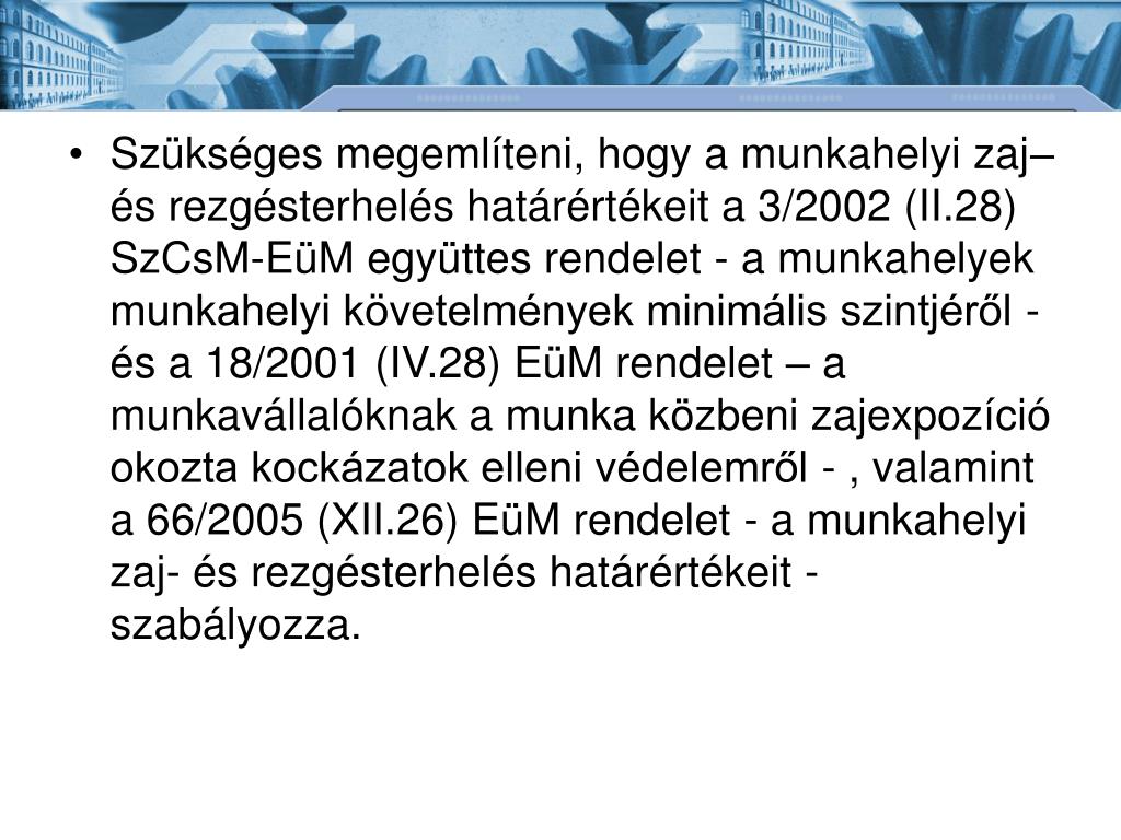Szükséges megemlíteni, hogy a munkahelyi zaj– és rezgésterhelés határértékeit a 3/2002 (II.28) SzCsM-EüM együttes rendelet - a munkahelyek munkahelyi követelmények minimális szintjéről - és a 18/2001 (IV.28) EüM rendelet – a munkavállalóknak a munka közbeni zajexpozíció okozta kockázatok elleni védelemről - , valamint a 66/2005 (XII.26) EüM rendelet - a munkahelyi zaj- és rezgésterhelés határértékeit - szabályozza.