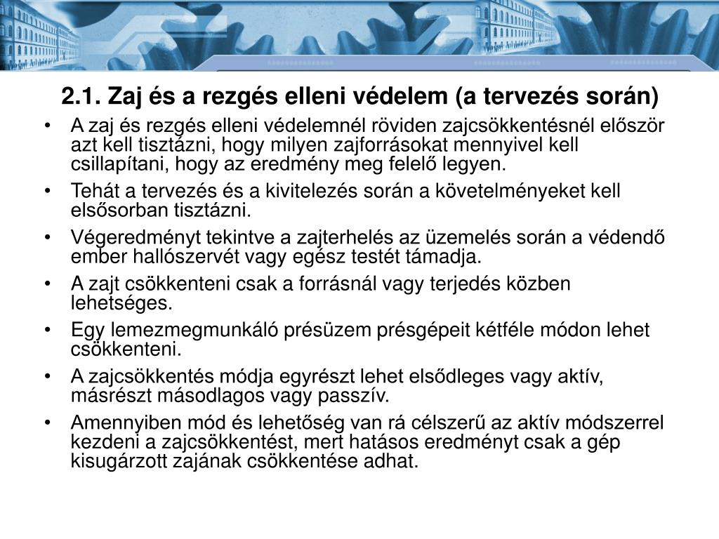 2.1. Zaj és a rezgés elleni védelem (a tervezés során) • A zaj és rezgés elleni védelemnél röviden zajcsökkentésnél először azt kell tisztázni, hogy milyen zajforrásokat mennyivel kell csillapítani, hogy az eredmény meg felelő legyen. • Tehát a tervezés és a kivitelezés során a követelményeket kell elsősorban tisztázni. • Végeredményt tekintve a zajterhelés az üzemelés során a védendő ember hallószervét vagy egész testét támadja. • A zajt csökkenteni csak a forrásnál vagy terjedés közben lehetséges. • Egy lemezmegmunkáló présüzem présgépeit kétféle módon lehet csökkenteni. • A zajcsökkentés módja egyrészt lehet elsődleges vagy aktív, másrészt másodlagos vagy passzív. • Amennyiben mód és lehetőség van rá célszerű az aktív módszerrel kezdeni a zajcsökkentést, mert hatásos eredményt csak a gép kisugárzott zajának csökkentése adhat.
