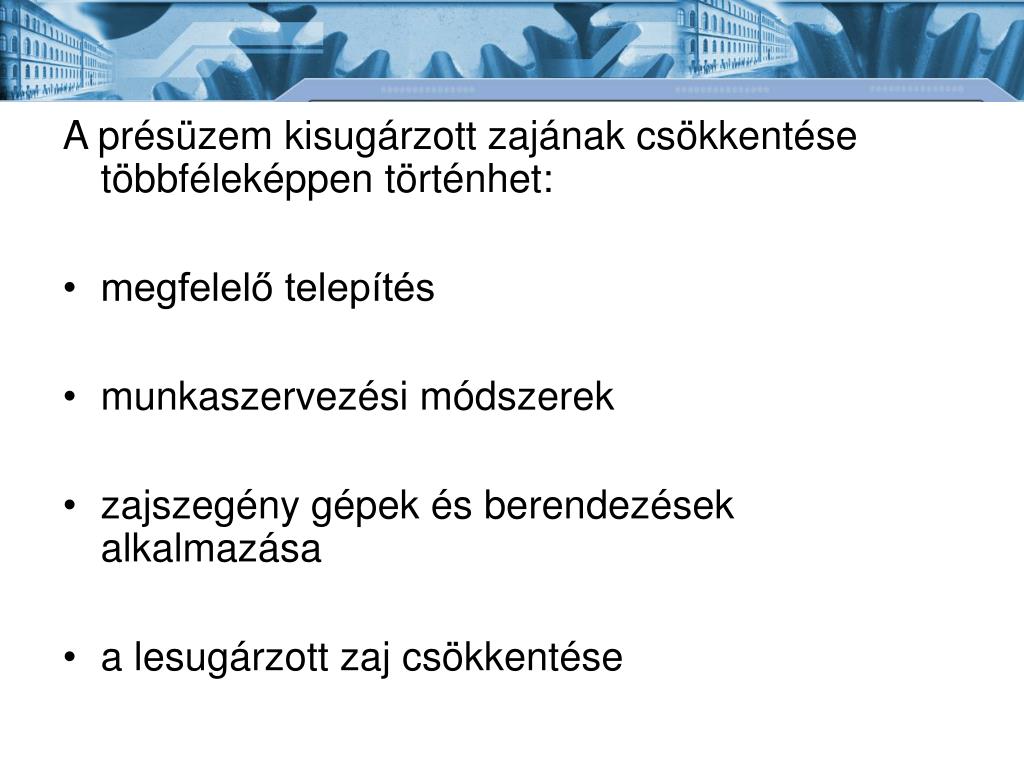 A présüzem kisugárzott zajának csökkentése többféleképpen történhet: • megfelelő telepítés • munkaszervezési módszerek • zajszegény gépek és berendezések alkalmazása • a lesugárzott zaj csökkentése