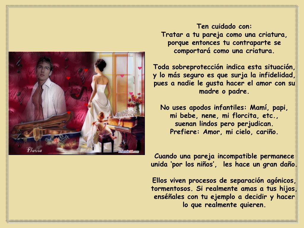 Ten cuidado con: Tratar a tu pareja como una criatura, porque entonces tu contraparte se comportará como una criatura. Toda sobreprotección indica esta situación, y lo más seguro es que surja la infidelidad, pues a nadie le gusta hacer el amor con su madre o padre. No uses apodos infantiles: Mamí, papi, mi bebe, nene, mi florcita, etc., suenan lindos pero perjudican. Prefiere: Amor, mi cielo, cariño. Cuando una pareja incompatible permanece unida ‘por los niños’, les hace un gran daño. Ellos viven procesos de separación agónicos, tormentosos. Si realmente amas a tus hijos, enséñales con tu ejemplo a decidir y hacer lo que realmente quieren.