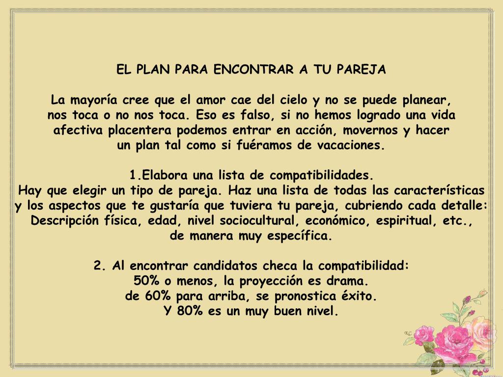 EL PLAN PARA ENCONTRAR A TU PAREJA • La mayoría cree que el amor cae del cielo y no se puede planear, nos toca o no nos toca. Eso es falso, si no hemos logrado una vida afectiva placentera podemos entrar en acción, movernos y hacer un plan tal como si fuéramos de vacaciones. • Elabora una lista de compatibilidades.Hay que elegir un tipo de pareja. Haz una lista de todas las características y los aspectos que te gustaría que tuviera tu pareja, cubriendo cada detalle: Descripción física, edad, nivel sociocultural, económico, espiritual, etc., de manera muy específica. • 2. Al encontrar candidatos checa la compatibilidad: • 50% o menos, la proyección es drama. • de 60% para arriba, se pronostica éxito. • Y 80% es un muy buen nivel.