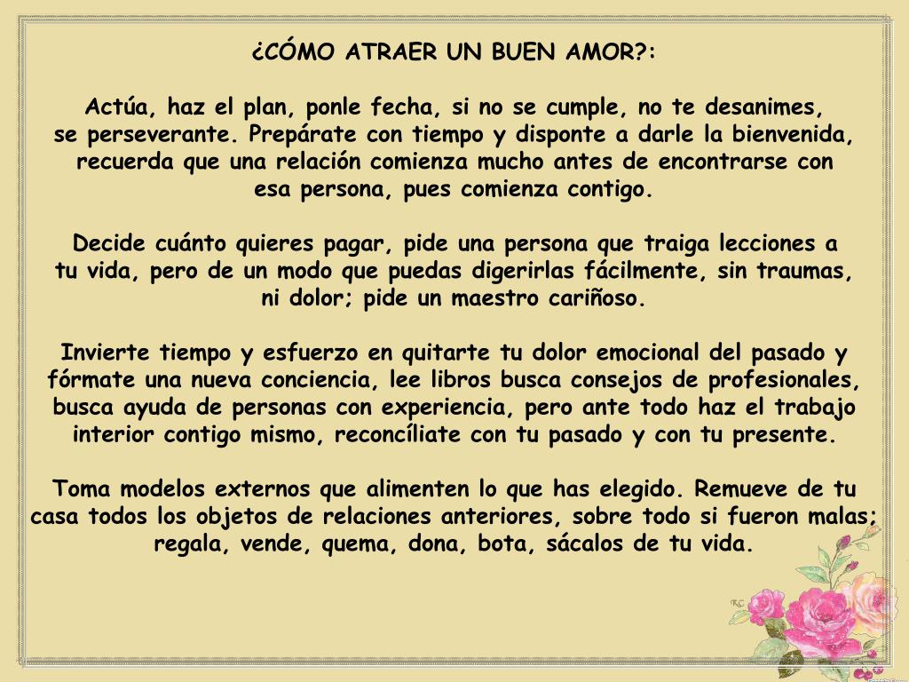 ¿CÓMO ATRAER UN BUEN AMOR?: Actúa, haz el plan, ponle fecha, si no se cumple, no te desanimes, se perseverante. Prepárate con tiempo y disponte a darle la bienvenida, recuerda que una relación comienza mucho antes de encontrarse con esa persona, pues comienza contigo. Decide cuánto quieres pagar, pide una persona que traiga lecciones a tu vida, pero de un modo que puedas digerirlas fácilmente, sin traumas, ni dolor; pide un maestro cariñoso. Invierte tiempo y esfuerzo en quitarte tu dolor emocional del pasado y fórmate una nueva conciencia, lee libros busca consejos de profesionales, busca ayuda de personas con experiencia, pero ante todo haz el trabajo interior contigo mismo, reconcíliate con tu pasado y con tu presente. Toma modelos externos que alimenten lo que has elegido. Remueve de tu casa todos los objetos de relaciones anteriores, sobre todo si fueron malas; regala, vende, quema, dona, bota, sácalos de tu vida.