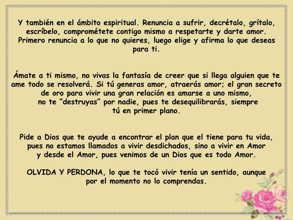 Y también en el ámbito espiritual. Renuncia a sufrir, decrétalo, grítalo, escríbelo, comprométete contigo mismo a respetarte y darte amor. Primero renuncia a lo que no quieres, luego elige y afirma lo que deseas para ti. Ámate a ti mismo, no vivas la fantasía de creer que si llega alguien que te ame todo se resolverá. Si tú generas amor, atraerás amor; el gran secreto de oro para vivir una gran relación es amarse a uno mismo, no te “destruyas” por nadie, pues te desequilibrarás, siempre tú en primer plano. Pide a Dios que te ayude a encontrar el plan que el tiene para tu vida, pues no estamos llamados a vivir desdichados, sino a vivir en Amor y desde el Amor, pues venimos de un Dios que es todo Amor. OLVIDA Y PERDONA, lo que te tocó vivir tenía un sentido, aunque por el momento no lo comprendas.