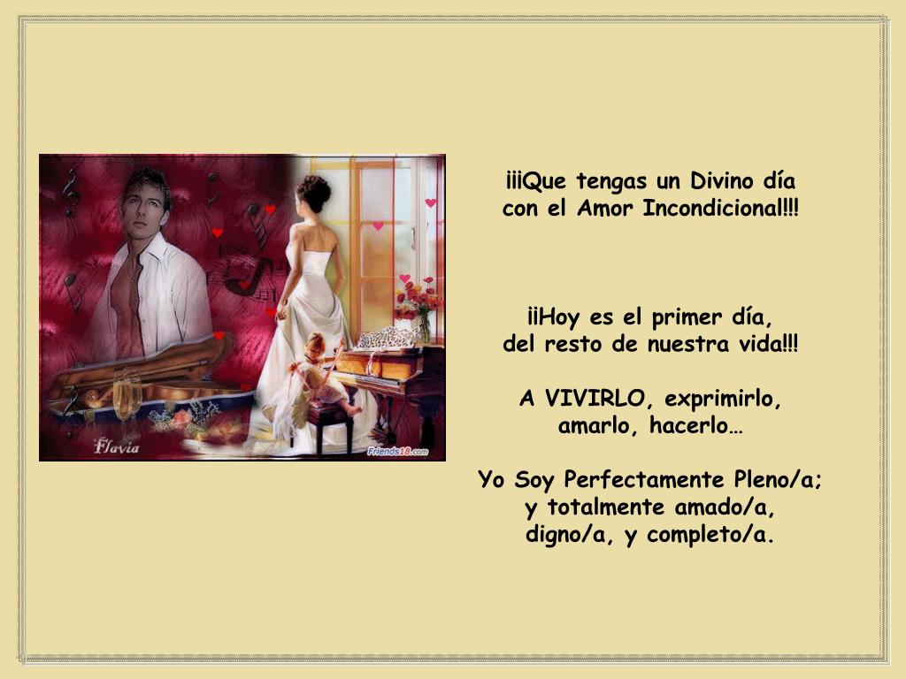 ¡¡¡Que tengas un Divino día con el Amor Incondicional!!! ¡¡Hoy es el primer día, del resto de nuestra vida!!! A VIVIRLO, exprimirlo, amarlo, hacerlo… Yo Soy Perfectamente Pleno/a; y totalmente amado/a, digno/a, y completo/a.