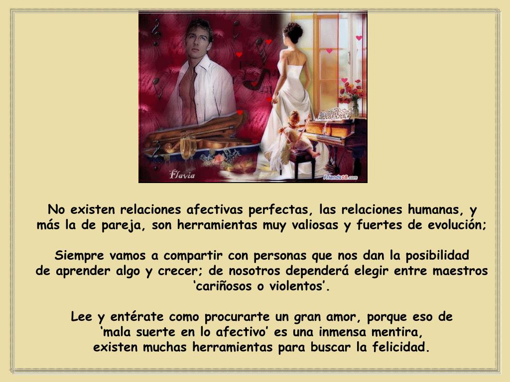 No existen relaciones afectivas perfectas, las relaciones humanas, y más la de pareja, son herramientas muy valiosas y fuertes de evolución; Siempre vamos a compartir con personas que nos dan la posibilidad de aprender algo y crecer; de nosotros dependerá elegir entre maestros ‘cariñosos o violentos’. Lee y entérate como procurarte un gran amor, porque eso de ‘mala suerte en lo afectivo’ es una inmensa mentira, existen muchas herramientas para buscar la felicidad.