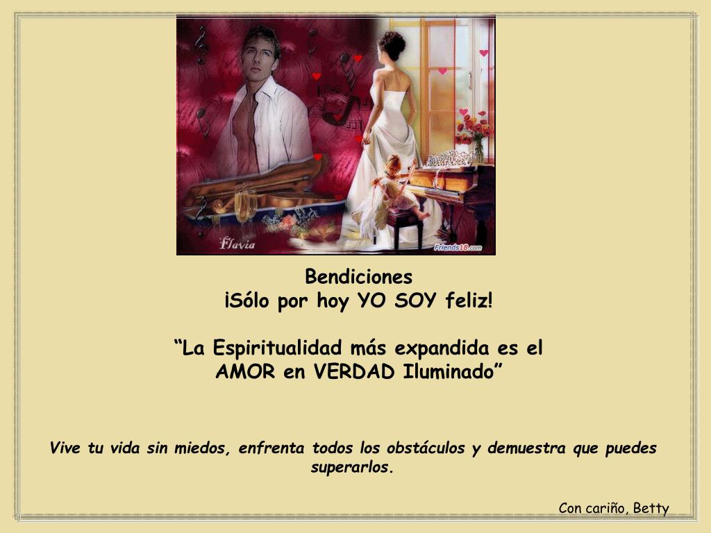 Bendiciones ¡Sólo por hoy YO SOY feliz! “La Espiritualidad más expandida es el AMOR en VERDAD Iluminado” Vive tu vida sin miedos, enfrenta todos los obstáculos y demuestra que puedes superarlos. Con cariño, Betty