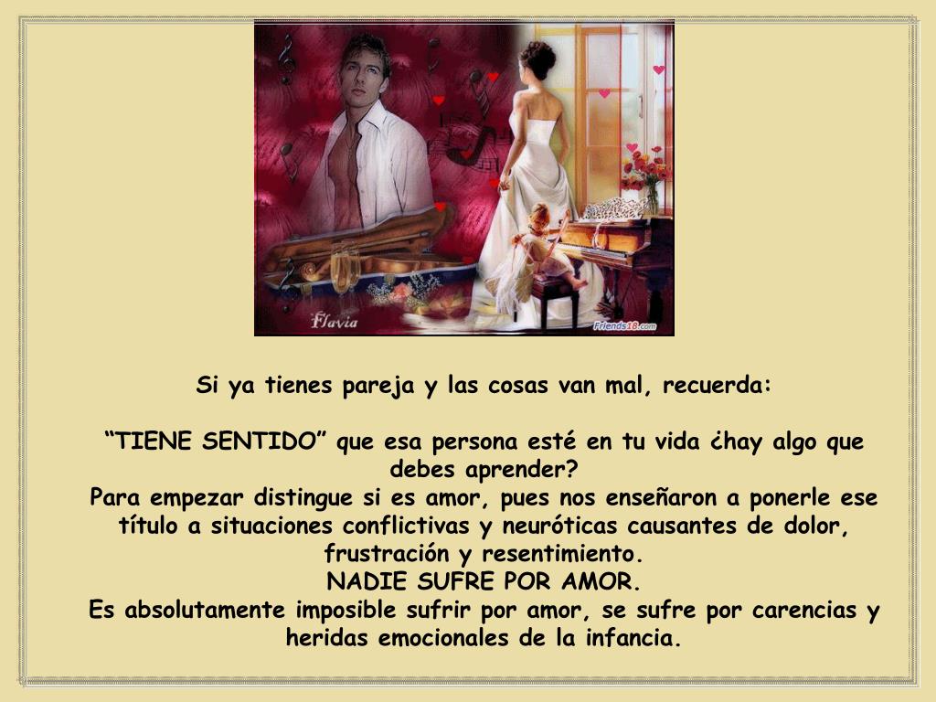 Si ya tienes pareja y las cosas van mal, recuerda: “TIENE SENTIDO” que esa persona esté en tu vida ¿hay algo que debes aprender? Para empezar distingue si es amor, pues nos enseñaron a ponerle ese título a situaciones conflictivas y neuróticas causantes de dolor, frustración y resentimiento. NADIE SUFRE POR AMOR. Es absolutamente imposible sufrir por amor, se sufre por carencias y heridas emocionales de la infancia.