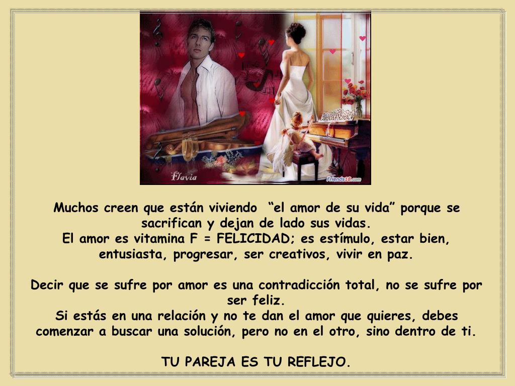 Muchos creen que están viviendo “el amor de su vida” porque se sacrifican y dejan de lado sus vidas. El amor es vitamina F = FELICIDAD; es estímulo, estar bien, entusiasta, progresar, ser creativos, vivir en paz. Decir que se sufre por amor es una contradicción total, no se sufre por ser feliz. Si estás en una relación y no te dan el amor que quieres, debes comenzar a buscar una solución, pero no en el otro, sino dentro de ti. TU PAREJA ES TU REFLEJO.