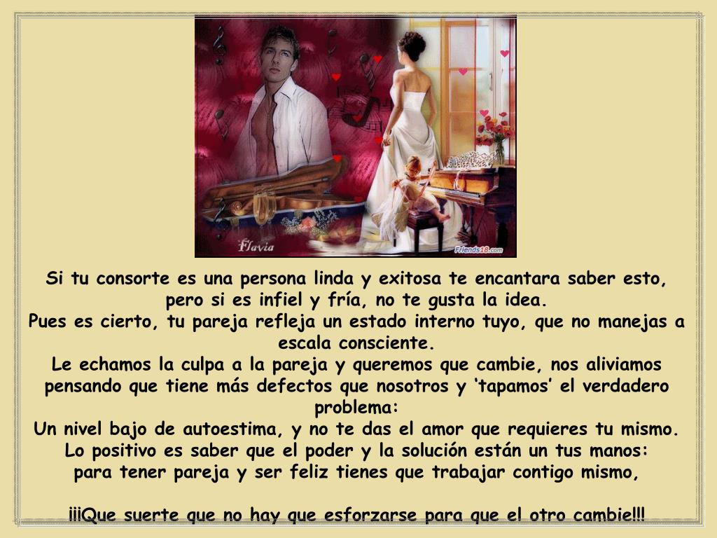 Si tu consorte es una persona linda y exitosa te encantara saber esto, pero si es infiel y fría, no te gusta la idea. Pues es cierto, tu pareja refleja un estado interno tuyo, que no manejas a escala consciente. Le echamos la culpa a la pareja y queremos que cambie, nos aliviamos pensando que tiene más defectos que nosotros y ‘tapamos’ el verdadero problema: Un nivel bajo de autoestima, y no te das el amor que requieres tu mismo. Lo positivo es saber que el poder y la solución están un tus manos: para tener pareja y ser feliz tienes que trabajar contigo mismo, ¡¡¡Que suerte que no hay que esforzarse para que el otro cambie!!!