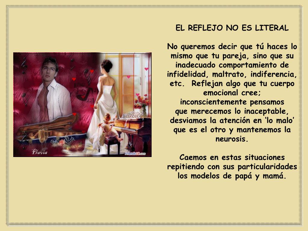 EL REFLEJO NO ES LITERAL No queremos decir que tú haces lo mismo que tu pareja, sino que su inadecuado comportamiento de infidelidad, maltrato, indiferencia, etc. Reflejan algo que tu cuerpo emocional cree; inconscientemente pensamos que merecemos lo inaceptable, desviamos la atención en ‘lo malo’ que es el otro y mantenemos la neurosis. Caemos en estas situaciones repitiendo con sus particularidades los modelos de papá y mamá.
