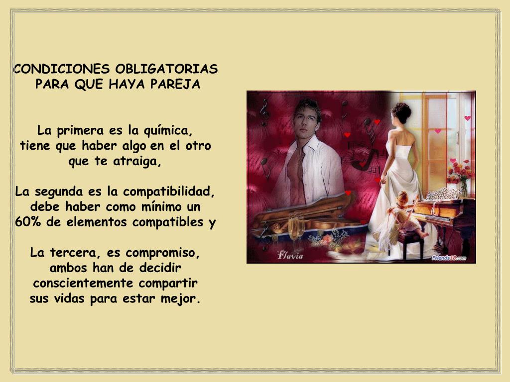 CONDICIONES OBLIGATORIAS PARA QUE HAYA PAREJA La primera es la química, tiene que haber algoen el otro que te atraiga, La segunda es la compatibilidad, debe haber como mínimo un 60% de elementos compatibles y La tercera, es compromiso, ambos han de decidir conscientemente compartir sus vidas para estar mejor.