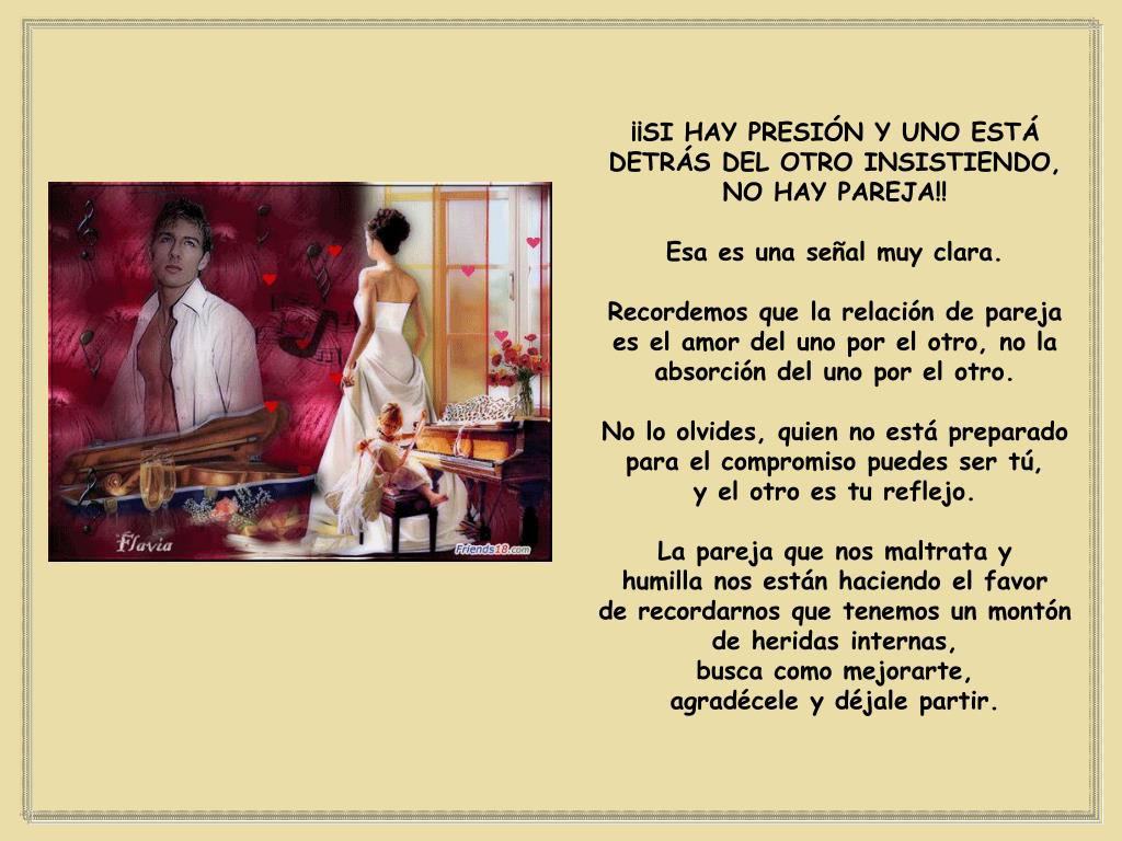 ¡¡SI HAY PRESIÓN Y UNO ESTÁ DETRÁS DEL OTRO INSISTIENDO, NO HAY PAREJA!! Esa es una señal muy clara. Recordemos que la relación de pareja es el amor del uno por el otro, no la absorción del uno por el otro. No lo olvides, quien no está preparado para el compromiso puedes ser tú, y el otro es tu reflejo. La pareja que nos maltrata y humilla nos están haciendo el favor de recordarnos que tenemos un montón de heridas internas, busca como mejorarte, agradécele y déjale partir.