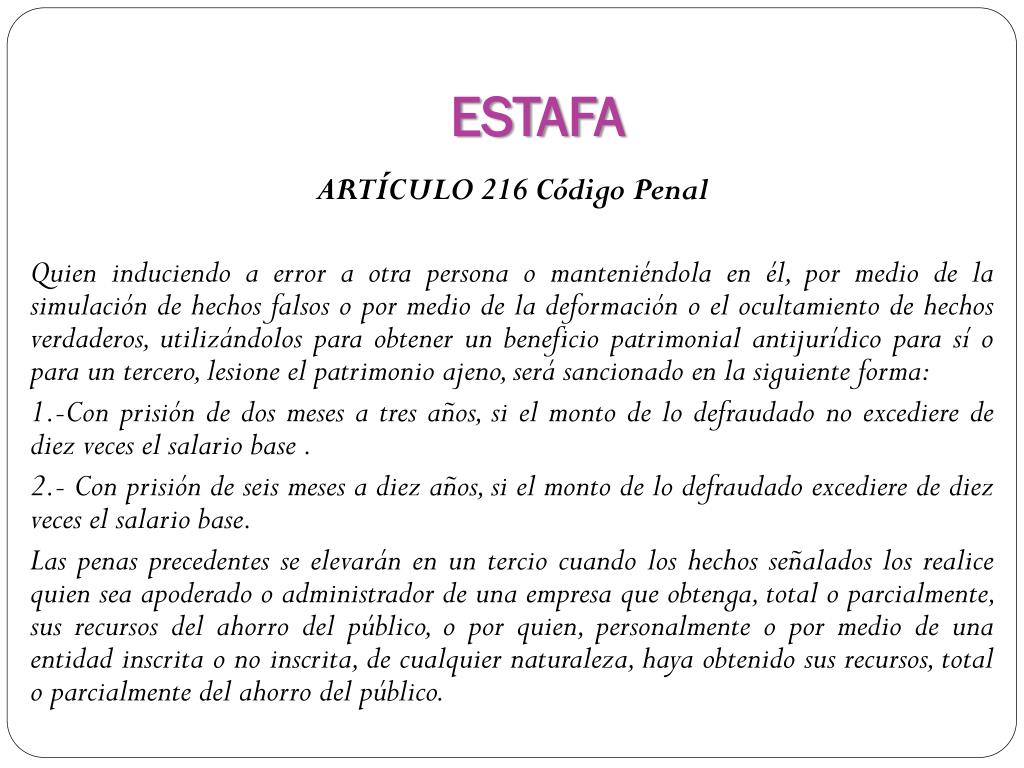 ESTAFA ARTÍCULO 216 Código Penal Quien induciendo a error a otra persona o manteniéndola en él, por medio de la simulación de hechos falsos o por medio de la deformación o el ocultamiento de hechos verdaderos, utilizándolos para obtener un beneficio patrimonial antijurídico para sí o para un tercero, lesione el patrimonio ajeno, será sancionado en la siguiente forma: 1.-Con prisión de dos meses a tres años, si el monto de lo defraudado no excediere de diez veces el salario base . 2.- Con prisión de seis meses a diez años, si el monto de lo defraudado excediere de diez veces el salario base. Las penas precedentes se elevarán en un tercio cuando los hechos señalados los realice quien sea apoderado o administrador de una empresa que obtenga, total o parcialmente, sus recursos del ahorro del público, o por quien, personalmente o por medio de una entidad inscrita o no inscrita, de cualquier naturaleza, haya obtenido sus recursos, total o parcialmente del ahorro del público.