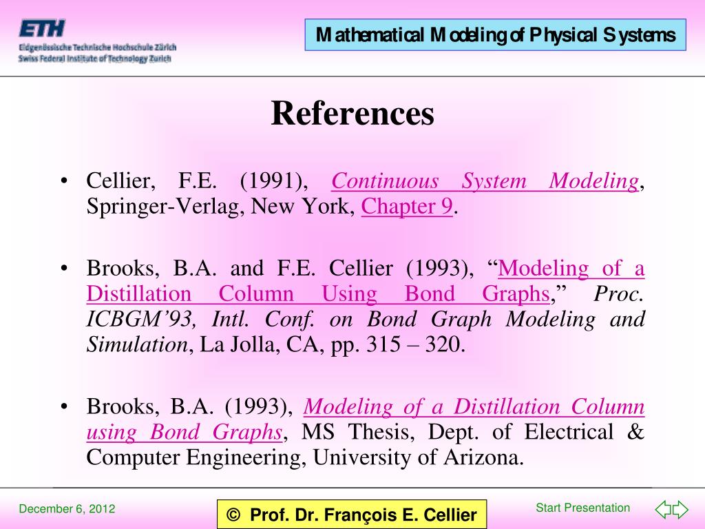 Cellier, F.E. (1991), Continuous System Modeling, Springer-Verlag, New York, Chapter 9. Brooks, B.A. and F.E. Cellier (1993), “Modeling of a Distillation Column Using Bond Graphs,” Proc. ICBGM’93, Intl. Conf. on Bond Graph Modeling and Simulation, La Jolla, CA, pp. 315 – 320. Brooks, B.A. (1993), Modeling of a Distillation Column using Bond Graphs, MS Thesis, Dept. of Electrical & Computer Engineering, University of Arizona. References