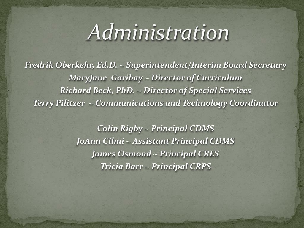 Administration Fredrik Oberkehr, Ed.D. ~ Superintendent/Interim Board Secretary MaryJane Garibay ~ Director of Curriculum Richard Beck, PhD. ~ Director of Special Services Terry Pilitzer ~ Communications and Technology Coordinator Colin Rigby ~ Principal CDMS JoAnn Cilmi ~ Assistant Principal CDMS James Osmond ~ Principal CRES Tricia Barr ~ Principal CRPS