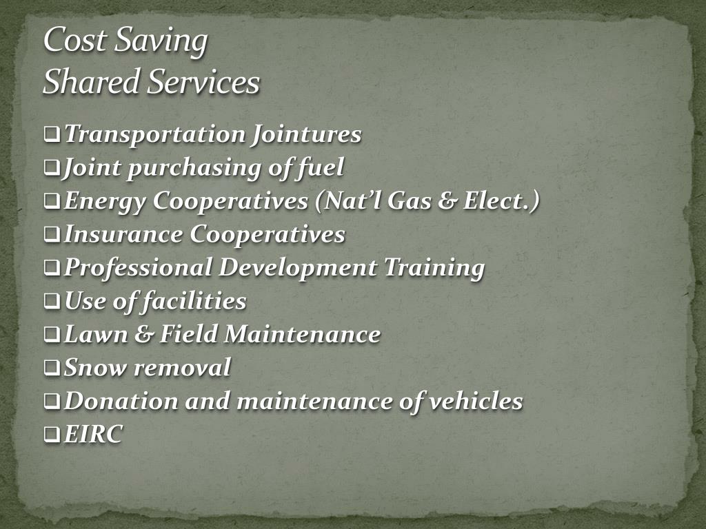 Cost SavingShared Services • Transportation Jointures • Joint purchasing of fuel • Energy Cooperatives (Nat’l Gas & Elect.) • Insurance Cooperatives • Professional Development Training • Use of facilities • Lawn & Field Maintenance • Snow removal • Donation and maintenance of vehicles • EIRC