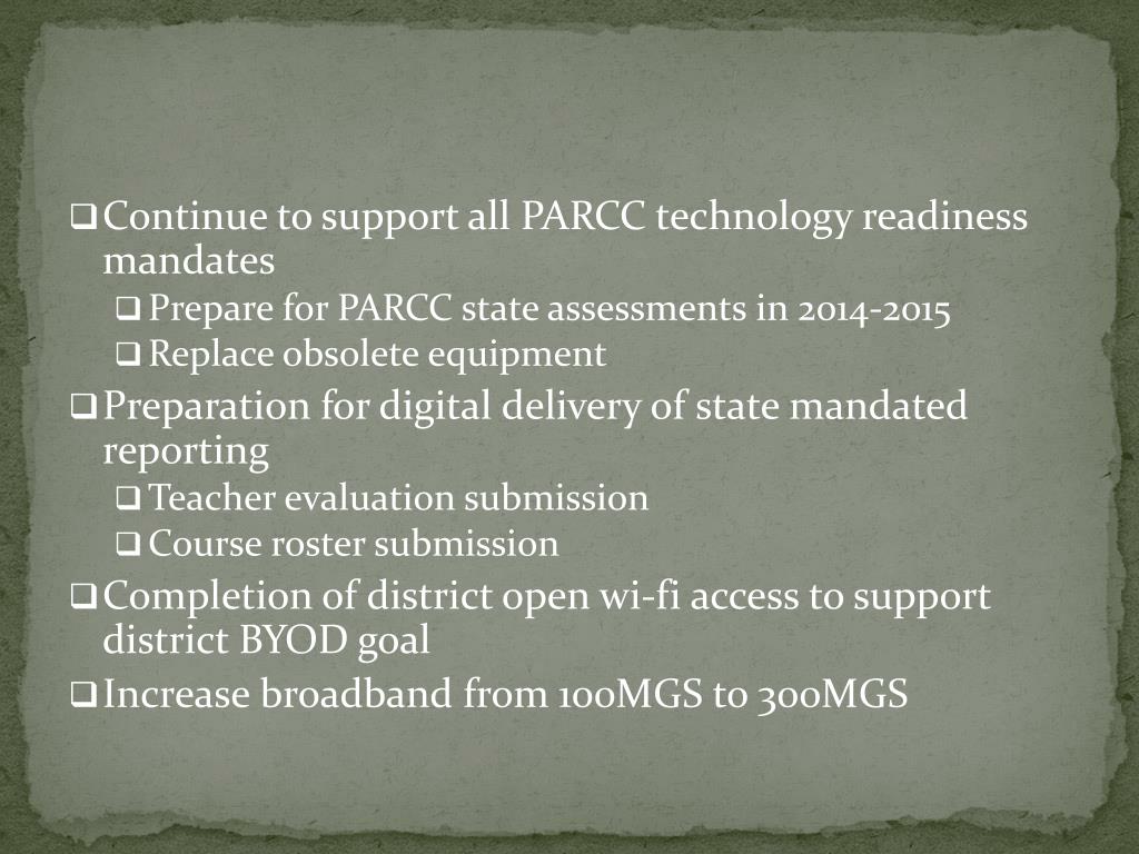 Continue to support all PARCC technology readiness mandates • Prepare for PARCC state assessments in 2014-2015 • Replace obsolete equipment • Preparation for digital delivery of state mandated reporting • Teacher evaluation submission • Course roster submission • Completion of district open wi-fi access to support district BYOD goal • Increase broadband from 100MGS to 300MGS
