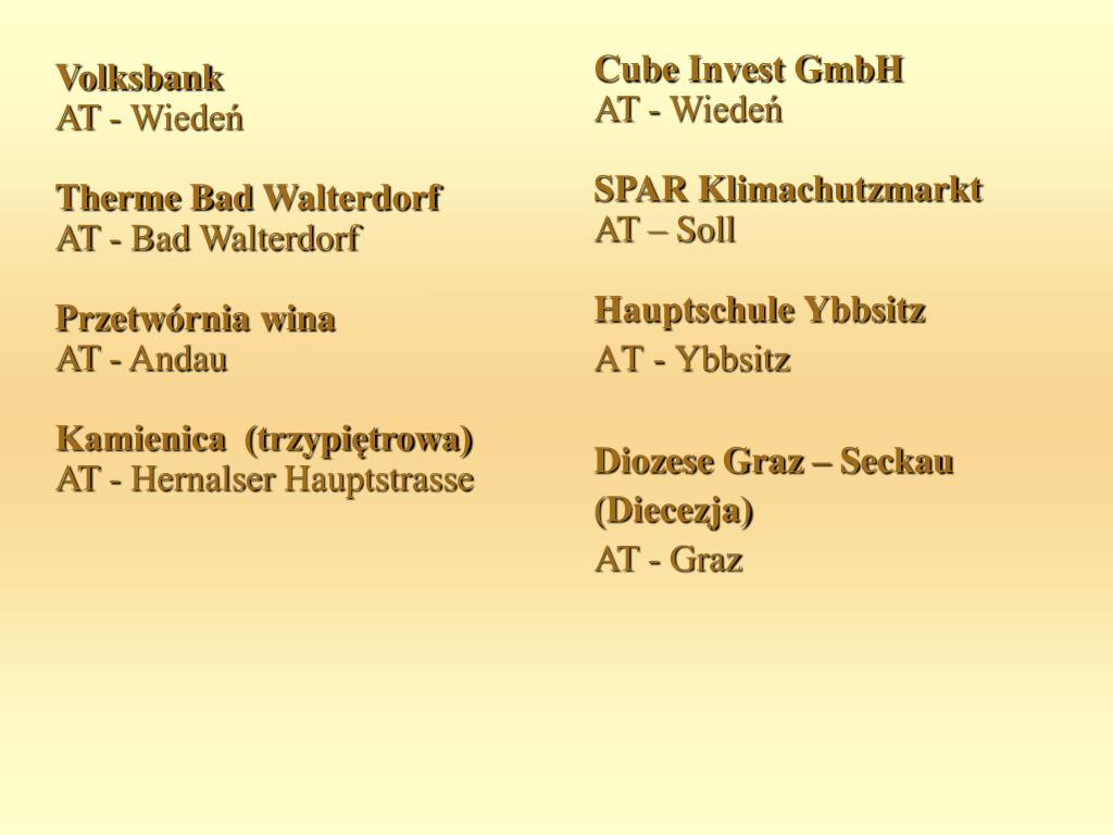 Cube Invest GmbH AT - Wiedeń SPAR Klimachutzmarkt AT – Soll HauptschuleYbbsitz AT - Ybbsitz Diozese Graz – Seckau (Diecezja) AT - Graz Volksbank AT - Wiedeń Therme Bad Walterdorf AT - Bad Walterdorf Przetwórnia wina AT - Andau Kamienica (trzypiętrowa) AT - HernalserHauptstrasse