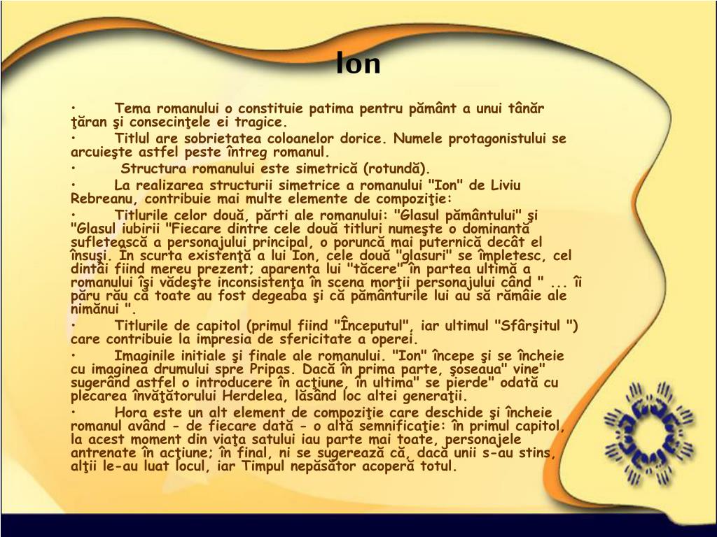 Ion • Tema romanului o constituie patima pentru pământ a unui tânăr ţăran şi consecinţele ei tragice. • Titlul are sobrietatea coloanelor dorice. Numele protagonistului se arcuieşte astfel peste întreg romanul. • Structura romanului este simetrică (rotundă). • La realizarea structurii simetrice a romanului "Ion" de Liviu Rebreanu, contribuie mai multe elemente de compoziţie: • Titlurile celor două, părti ale romanului: "Glasul pământului" şi "Glasul iubirii "Fiecare dintre cele două titluri numeşte o dominantă sufletească a personajului principal, o poruncă mai puternică decât el însuşi. În scurta existenţă a lui Ion, cele două "glasuri" se împletesc, cel dintâi fiind mereu prezent; aparenta lui "tăcere" în partea ultimă a romanului îşi vădeşte inconsistenţa în scena morţii personajului când " ... îi păru rău că toate au fost degeaba şi că pământurile lui au să rămâie ale nimănui ". • Titlurile de capitol (primul fiind "Începutul", iar ultimul "Sfârşitul ") care contribuie la impresia de sfericitate a operei. • Imaginile initiale şi finale ale romanului. "Ion" începe şi se încheie cu imaginea drumului spre Pripas. Dacă în prima parte, şoseaua" vine" sugerând astfel o introducere în acţiune, în ultima" se pierde" odată cu plecarea învăţătorului Herdelea, lăsând loc altei generaţii. • Hora este un alt element de compoziţie care deschide şi încheie romanul având - de fiecare dată - o altă semnificaţie: în primul capitol, la acest moment din viaţa satului iau parte mai toate, personajele antrenate în acţiune; în final, ni se sugerează că, dacă unii s-au stins, alţii le-au luat locul, iar Timpul nepăsător acoperă totul.