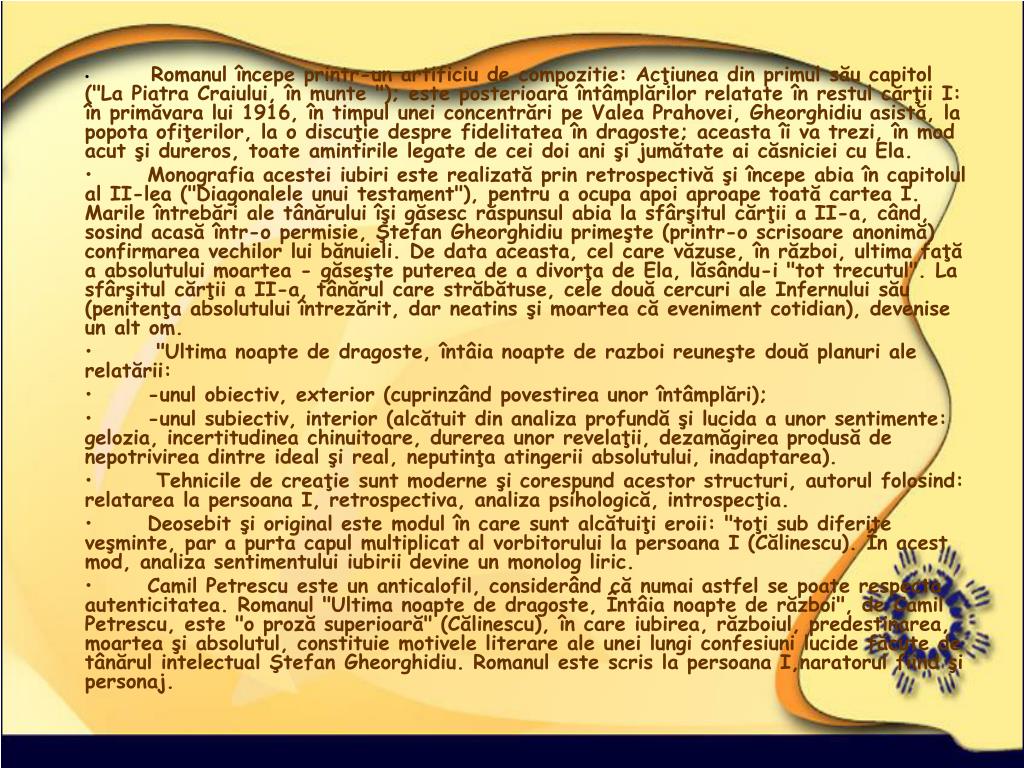 Ultima noapte de dragoste , intaia noapte de razboi • Tema romanului o constituie dragostea şi războiul ca experienţe ale căutătorului de absolut. • Titlul ar putea sugera rătăcirea tânărului Ştefan Gheorghidiu prin "noaptea" incertitudini lor şi a întrebărilor fără răspuns legate de iubire şi de război. • Romanul este o specie a genului epic. Operă narativă în proză. de mare amploare şi diversitate. a cărei acţiune se desfăşoară pe mai multe planuri. romanul are un conflict bine marcat şi personaje complexe."Ultima noapte de dragoste... ", de Camil Petrescu, se încadrează în specie, fiind un text narativ în proză, de întindere mare, cu personaje complexe. • În acelaşi timp, acest roman prezintă şi o seamă de particularităţi. • Astfel, sursa de inspiraţie o constituie lumea interioară, trăirile lăuntrice ale unui tânăr: neliniştea, incertitudinea, înstrăinarea, chinul. • Timpul calendaristic, obiectiv este înlocuit cu un timp subiectiv, cu întoarceri în trecut, aşa cum le cere fluxul memoriei. Personajul este atipic, acesta confundându-se cu naratorul, într-o naraţiune subiectivă, la persoana I. Acestor trăsături (care aparţin de romanul modern) li se adaugă o structură originală, de asemenea modernă. • Structura compoziţională a romanului "Ultima noapte de dragoste, întâia noapte de război”, de Camil Petrescu, ar putea fi caracterizată prin mai multe trăsături: • Romanul este alcătuit din două cărţicorespunzătoare celor două jumătăţi ale titlului: Cartea I este "istoria geloziei lui Ştefan Gheorghidiu" (Călinescu), iar metafora din titlu ar putea sugera ratăcirile personajului prin "noaptea" incertitudinilor sale, legate de iubirea pentru soţia sa Ela. • Cartea a II-a constituie" un jurnal de campanie" (Călinescu) în care este evocat spectacolul apocaliptic al războiului - în fond tot o "noapte" sfărşită adesea în moarte. • Liantul dintre cele două cărţi este Ştefan Gheorghidiu tânărul ars de febra ideilor, "inteligent şi neprihănit" (cum îl caracteriza G. Călinescu). Autorul încearcă astfel să răspundă la întrebarea: Cum pri-veşte dragostea şi cum trăieşte drama războiului căutătorul de absolut?