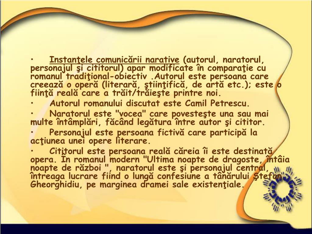 Instanţele comunicării narative (autorul, naratorul, personajul şi cititorul) apar modificate în comparaţie cu romanul tradiţional-obiectiv .Autorul este persoana care creează o operă (literară, ştiinţifică, de artă etc.); este o fiinţă reală care a trăit/trăieşte printre noi. • Autorul romanului discutat este Camil Petrescu. • Naratorul este "vocea" care povesteşte una sau mai multe întâmplări, făcând legătura între autor şi cititor. • Personajul este persoana fictivă care participă la acţiunea unei opere literare. • Cititorul este persoana reală căreia îi este destinată opera. În romanul modern "Ultima noapte de dragoste, întâia noapte de război ", naratorul este şi personajul central, întreaga lucrare fiind o lungă confesiune a tânărului Ştefan Gheorghidiu, pe marginea dramei sale existenţiale.