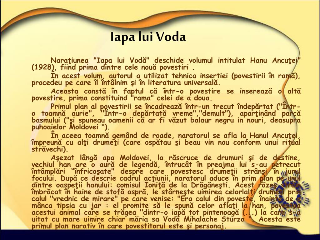 Iapa lui Voda Naraţiunea "Iapa lui Vodă" deschide volumul intitulat Hanu Ancuţei" (1928), fiind prima dintre cele nouă povestiri . În acest volum, autorul a utilizat tehnica insertiei (povestirii în ramă), procedeu pe care îl întâlnim şi înliteratura universală. Aceasta constă în faptul că într-o povestire se inserează o altă povestire, prima constituind "rama" celei de a doua. Primul plan al povestirii se încadrează într-un trecut îndepărtat ("Într-o toamnă aurie", "Într-o depărtată vreme","demult"), aparţinând parcă basmului ("şi spuneau oamenii că ar fi văzut balaur negru in nouri, deasupra puhoaielor Moldovei "). În aceea toamnă gemând de roade, naratorul se afla la Hanul Ancuţei, împreună cu alţi drumeţi (care ospătau şi beau vin nou conform unui ritual străvechi). Aşezat lângă apa Moldovei, la răscruce de drumuri şi de destine, vechiul han are o aură delegendă, întrucât în preajma lui s-au petrecut întâmplări “înfricoşate" despre care povestesc drumeţii strânşi în jurul focului. După ce descrie cadrul acţiunii, naratorul aduce în prim plan pe unul dintre oaspeţii hanului: comisul Ioniţă de la Drăgăneşti. Acest răzeş străin îmbrăcat în haine de stofă aspră, le stârneşte uimirea celorlalţi drumeţi prin calul "vrednic de mirare" pe care venise: "Era calul din poveste, înainte de a mânca tipsia cu jar : el promite să le spună celor aflaţi la han, povestea acestui animal care se trăgea "dintr-o iapă tot pintenoagă (...) la care s-a uitat cu mare uimire chiar măria sa Vodă Mihalache Sturza ". Acesta este primul plan narativ în care povestitorul este şi personaj.
