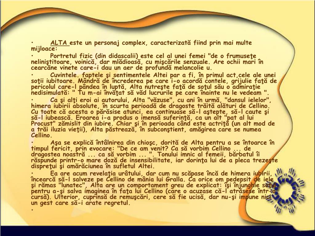 ALTA este un personaj complex, caracterizată fiind prin mai multe mijloace: • Portretul fizic (din didascalii) este cel al unei femei "de o frumuseţe neliniştitoare, voinică, dar mlădioasă, cu mişcările senzuale. Are ochii mari în cearcăne vinete care-i dau un aer de profundă melancolie u. • Cuvintele. faptele şi sentimentele Altei par a fi, în primul act,cele ale unei soţii iubitoare. Mândră de încrederea pe care i-o acordă contele, grijulie faţă de pericolul care-l pândea în luptă, Alta nutreşte faţă de soţul său o admiraţie nedisimulată: " Tu m-ai învăţat să văd lucrurile pe care înainte nu le vedeam ". • Ca şi alţi eroi ai autorului, Alta "văzuse", cu ani în urmă, "dansul ielelor", himera iubirii absolute, în scurta perioadă de dragoste trăită alături de Cellino. Cu toate că acesta o părăsise atunci, ea continuase să-l aştepte, să-l caute şi să-l iubească. Eroarea i-a produs o imensă suferinţă, ca un alt "pat al lui Procust" zămislit din iubire. Chiar şi în perioada când este actriţă (un alt mod de a trăi iluzia vieţii), Alta păstrează, în subconştient, amăgirea care se numea Cellino. • Aşa se explică întâlnirea din chioşc, dorită de Alta pentru a se întoarce în timpul fericit, prin evocare: "De ce am venit? Ca să vorbim Cellino ... de dragostea noastră ... ca să vorbim ... ". Tonului imnic al femeii, bărbatul îi răspunde printr-o mare doză de insensibilitate, iar dorinţa lui de a pleca trezeşte dispreţui şi amărăciunea în sufletul Altei. • Ea are acum revelaţia urâtului, dar cum nu scăpase încă de himera iubirii, încearcă să-l salveze pe Cellino de mânia lui Gralla. Ca orice om pedepsit de iele şi rămas "lunatec", Alta are un comportament greu de explicat: îşi înjunghie soţul pentru a-şi salva imaginea în faţa lui Cellino (care o acuzase că-l atrăsese într-o cursă). Ulterior, cuprinsă de remuşcări, cere să fie ucisă, dar nu-şi impune nici un gest care să-i arate regretul.