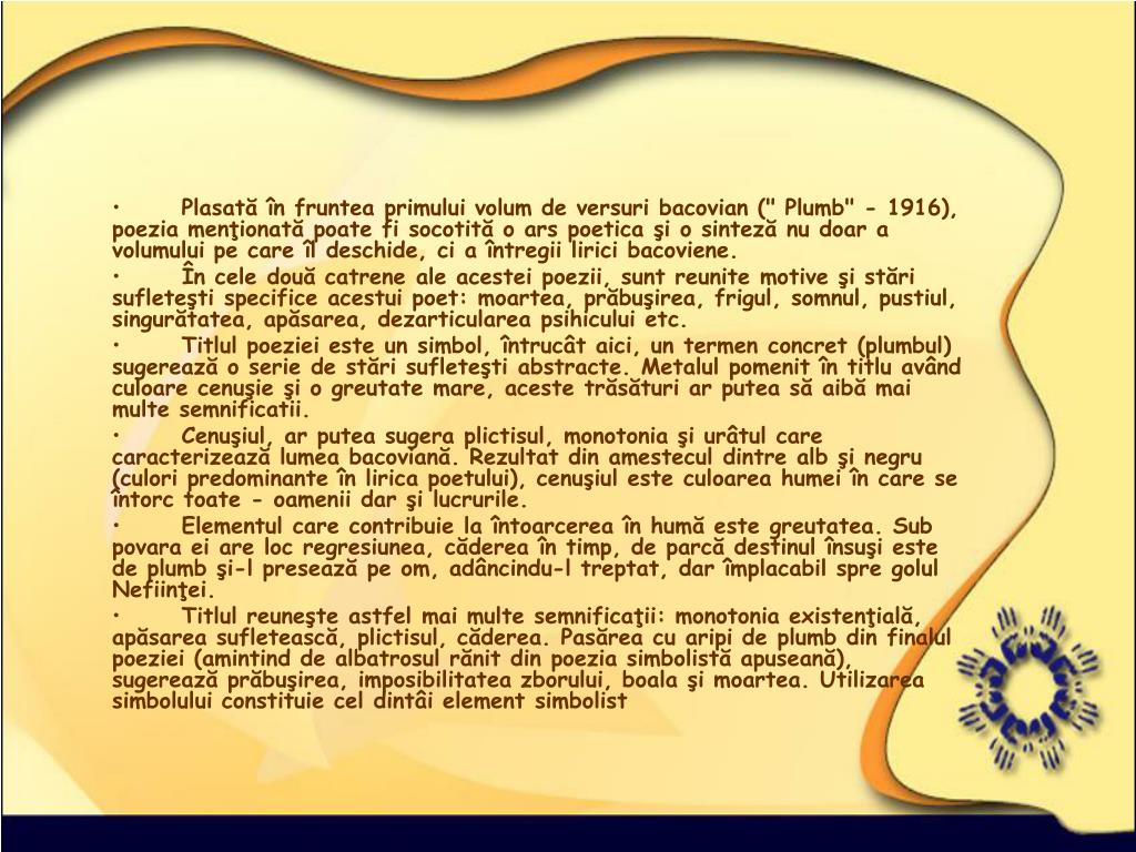 Plasată în fruntea primului volum de versuri bacovian (" Plumb" - 1916), poezia menţionată poate fi socotită o ars poetica şi o sinteză nu doar a volumului pe care îl deschide, ci a întregii lirici bacoviene. • În cele două catrene ale acestei poezii, sunt reunite motive şi stări sufleteşti specifice acestui poet: moartea, prăbuşirea, frigul, somnul, pustiul, singurătatea, apăsarea, dezarticularea psihicului etc. • Titlul poeziei este un simbol, întrucât aici, un termen concret (plumbul) sugerează o serie de stări sufleteşti abstracte. Metalul pomenit în titlu având culoare cenuşie şi o greutate mare, aceste trăsături ar putea să aibă mai multe semnificatii. • Cenuşiul, ar putea sugera plictisul, monotonia şi urâtul care caracterizează lumea bacoviană. Rezultat din amestecul dintre alb şi negru (culori predominante în lirica poetului), cenuşiul este culoarea humei în care se întorc toate - oamenii dar şi lucrurile. • Elementul care contribuie la întoarcerea în humă este greutatea. Sub povara ei are loc regresiunea, căderea în timp, de parcă destinul însuşi este de plumb şi-l presează pe om, adâncindu-l treptat, dar împlacabil spre golul Nefiinţei. • Titlul reuneşte astfel mai multe semnificaţii: monotonia existenţială, apăsarea sufletească, plictisul, căderea. Pasărea cu aripi de plumb din finalul poeziei (amintind de albatrosul rănit din poezia simbolistă apuseană), sugerează prăbuşirea, imposibilitatea zborului, boala şi moartea. Utilizarea simbolului constituie cel dintâi element simbolist