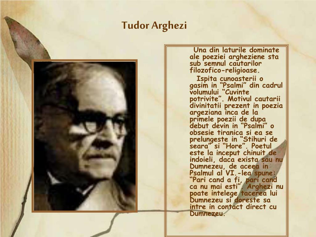 Tudor Arghezi Una din laturile dominate ale poeziei argheziene sta sub semnul cautarilor filozofico-religioase. Ispita cunoasterii o gasim in “Psalmi” din cadrul volumului “Cuvinte potrivite”. Motivul cautarii divinitatii prezent in poezia argeziana inca de la primele poezii de dupa debut devin in “Psalmi” o obsesie tiranica si ea se prelungeste in “Stihuri de seara” si “Hore”. Poetul este la inceput chinuit de indoieli, daca exista sau nu Dumnezeu, de aceea in Psalmul al VI.-lea spune: “Pari cand a fi, pari cand ca nu mai esti”. Arghezi nu poate intelege tacerea lui Dumnezeu si doreste sa intre in contact direct cu Dumnezeu.