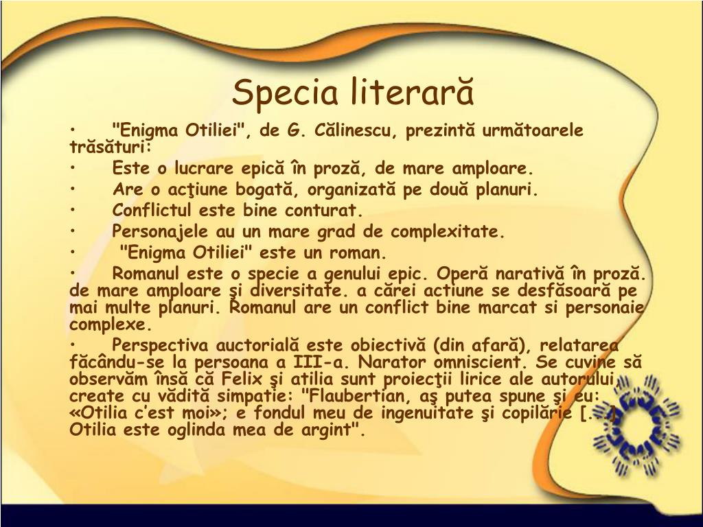 Specia literară • "Enigma Otiliei", de G. Călinescu, prezintă următoarele trăsături: • Este o lucrare epică în proză, de mare amploare. • Are o acţiune bogată, organizată pe două planuri. • Conflictul este bine conturat. • Personajele au un mare grad de complexitate. • "Enigma Otiliei" este un roman. • Romanul este o specie a genului epic. Operă narativă în proză. de mare amploare şi diversitate. a cărei actiune se desfăsoară pe mai multe planuri. Romanul are un conflict bine marcat si personaie complexe. • Perspectiva auctorială este obiectivă (din afară), relatarea făcându-se la persoana a III-a. Narator omniscient. Se cuvine să observăm însă că Felix şi atilia sunt proiecţii lirice ale autorului, create cu vădită simpatie: "Flaubertian, aş putea spune şi eu: «Otilia c’est moi»; e fondul meu de ingenuitate şi copilărie [...] Otilia este oglinda mea de argint".
