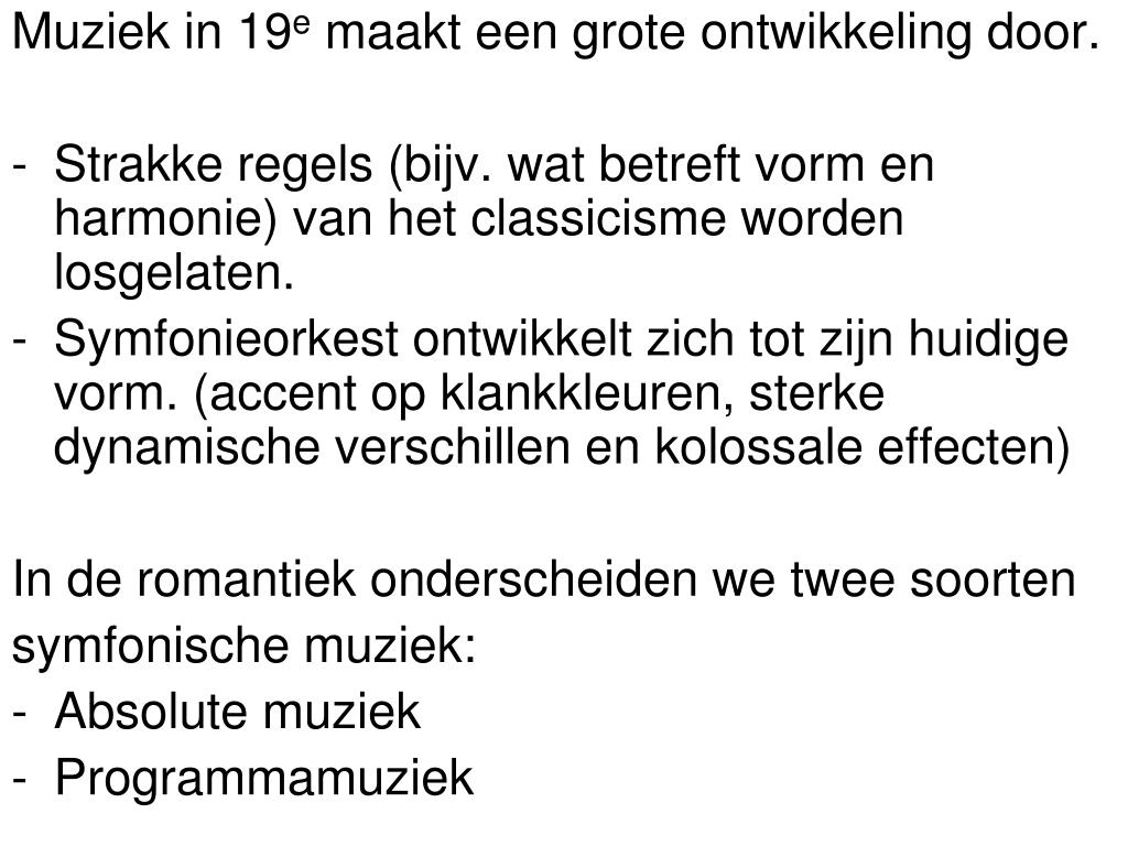 Muziek in 19e maakt een grote ontwikkeling door. • Strakke regels (bijv. wat betreft vorm en harmonie) van het classicisme worden losgelaten. • Symfonieorkest ontwikkelt zich tot zijn huidige vorm. (accent op klankkleuren, sterke dynamische verschillen en kolossale effecten) In de romantiek onderscheiden we twee soorten symfonische muziek: • Absolute muziek • Programmamuziek