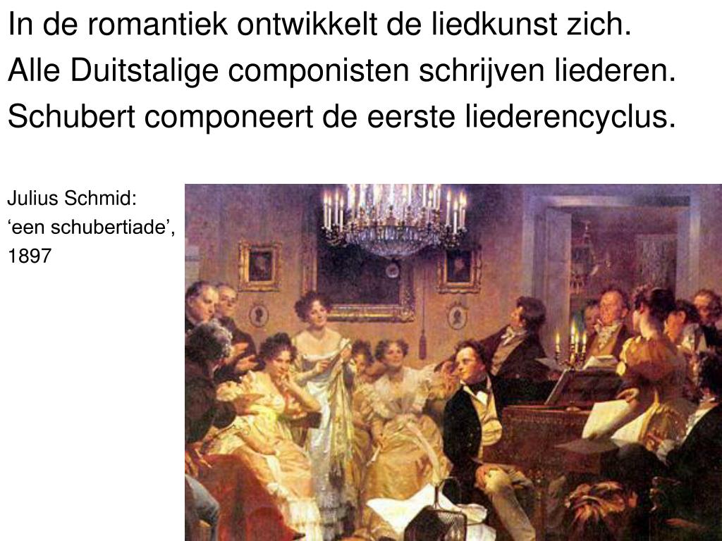 In de romantiek ontwikkelt de liedkunst zich. Alle Duitstalige componisten schrijven liederen. Schubert componeert de eerste liederencyclus. Julius Schmid: ‘een schubertiade’, 1897