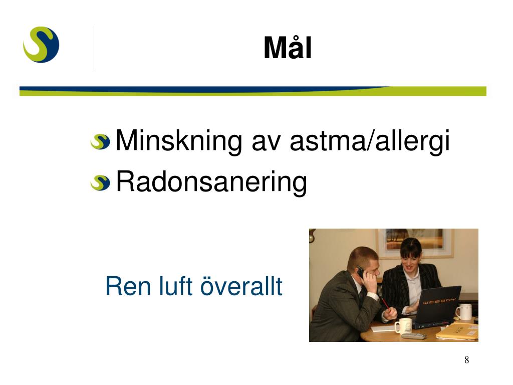 Ren luft överallt Mål • Minskning av astma/allergi • Radonsanering