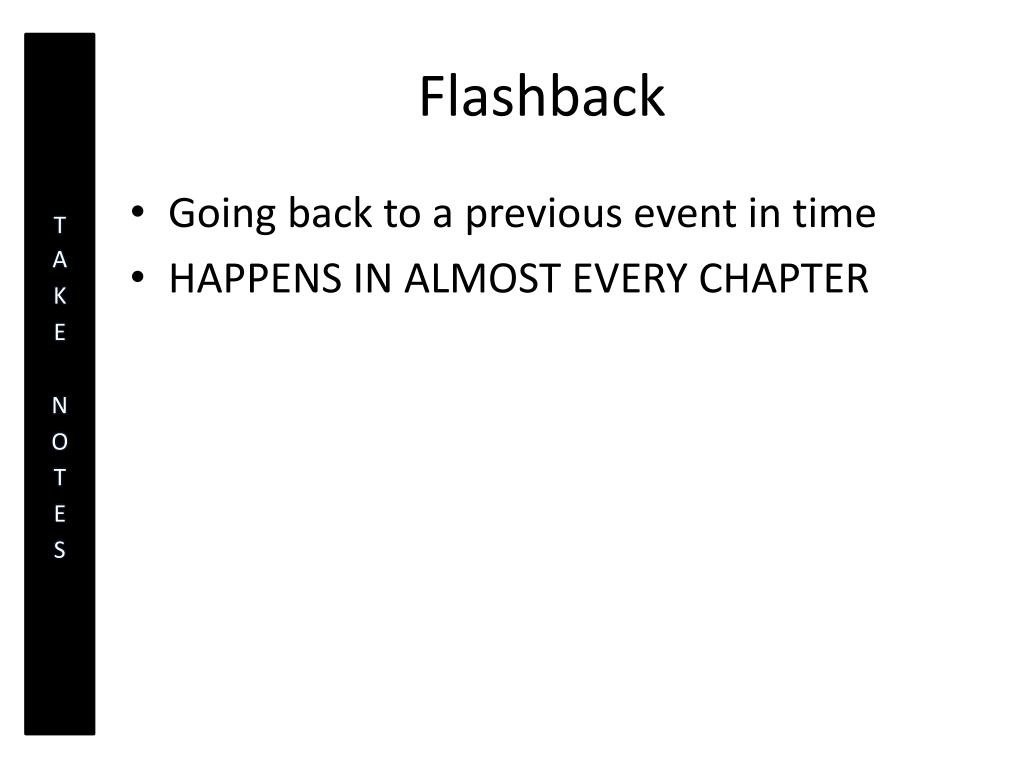 Flashback TAKE NOTES • Going back to a previous event in time • HAPPENS IN ALMOST EVERY CHAPTER