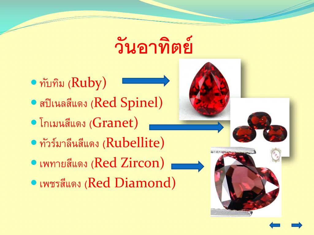 วันอาทิตย์ • ทับทิม (Ruby) • สปิเนลสีแดง (Red Spinel) • โกเมนสีแดง (Granet) • ทัวร์มาลีนสีแดง (Rubellite) • เพทายสีแดง (Red Zircon) • เพชรสีแดง (Red Diamond)