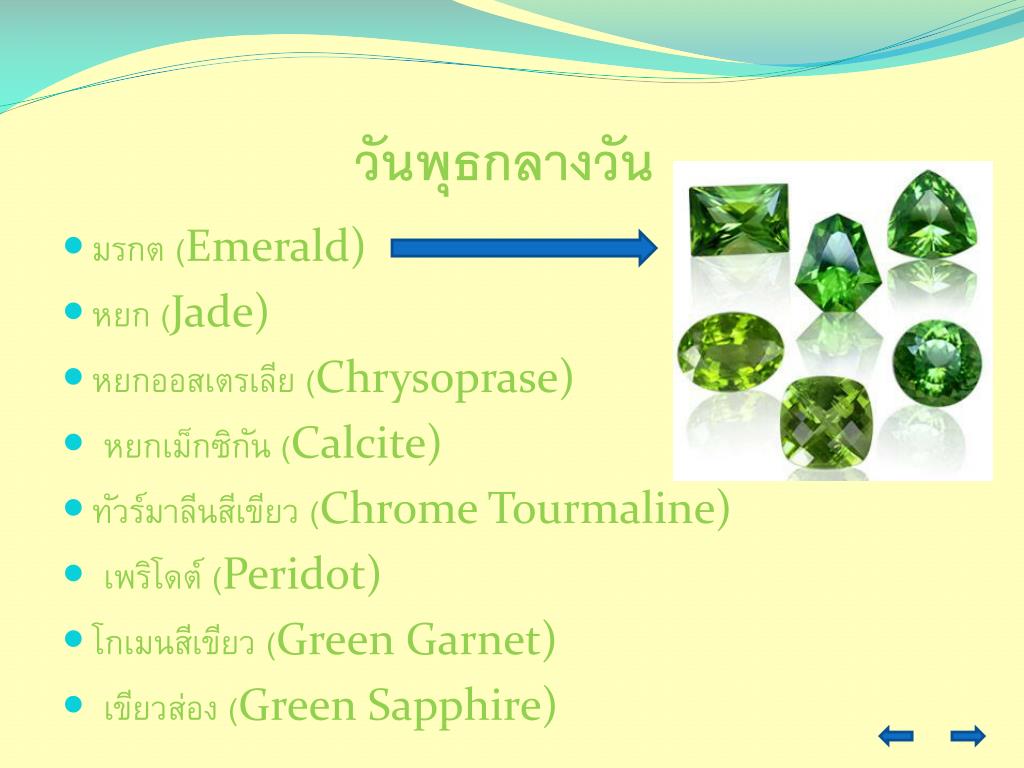 วันพุธกลางวัน • มรกต (Emerald) • หยก (Jade) • หยกออสเตรเลีย (Chrysoprase) • หยกเม็กซิกัน (Calcite) • ทัวร์มาลีนสีเขียว (Chrome Tourmaline) • เพริโดต์ (Peridot) • โกเมนสีเขียว (Green Garnet) • เขียวส่อง (Green Sapphire)