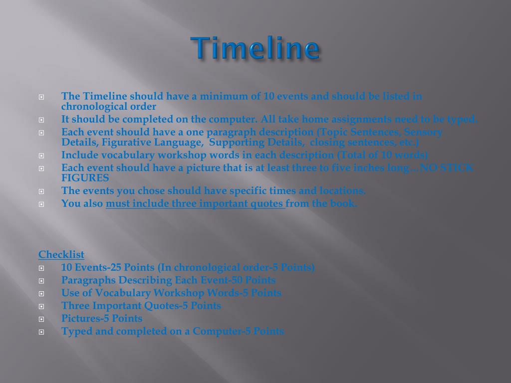 Timeline • The Timeline should have a minimum of 10 events and should be listed in chronological order • It should be completed on the computer. All take home assignments need to be typed. • Each event should have a one paragraph description (Topic Sentences, Sensory Details, Figurative Language, Supporting Details, closing sentences, etc.) • Include vocabulary workshop words in each description (Total of 10 words) • Each event should have a picture that is at least three to five inches long…NO STICK FIGURES • The events you chose should have specific times and locations. • You also must include three important quotes from the book. Checklist • 10 Events-25 Points (In chronological order-5 Points) • Paragraphs Describing Each Event-50 Points • Use of Vocabulary Workshop Words-5 Points • Three Important Quotes-5 Points • Pictures-5 Points • Typed and completed on a Computer-5 Points