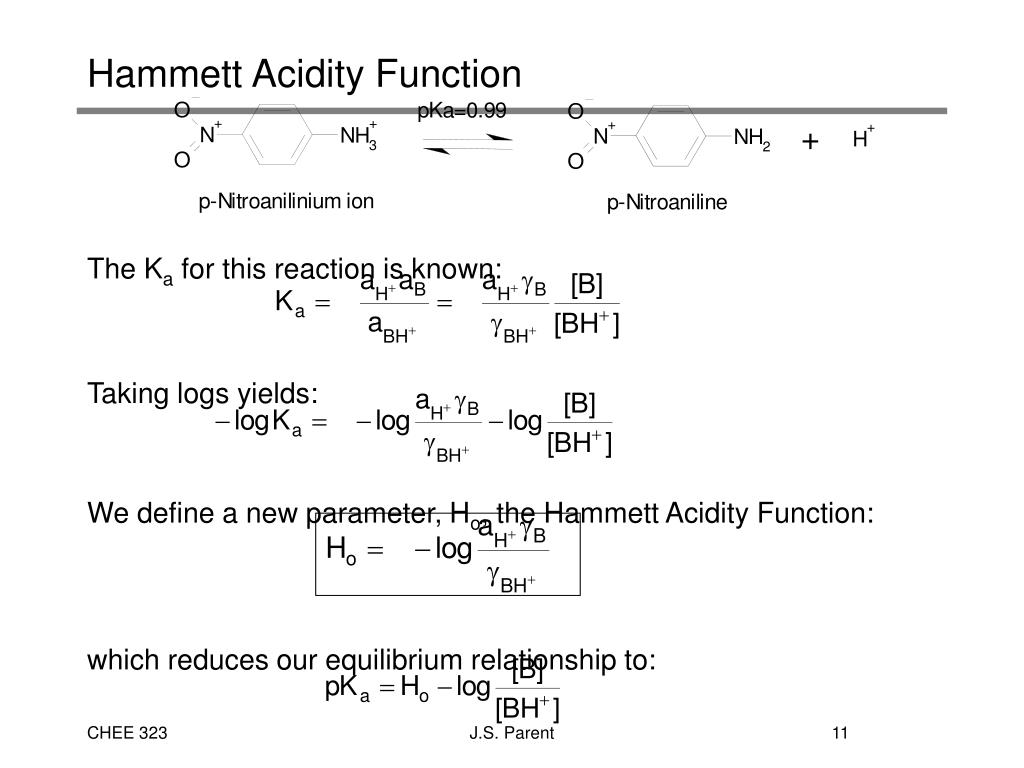 Hammett Acidity Function • To a series of acid solutions of varying concentration, an indicator of known pKa is added, and the ratio of [B] to [BH+] measured. • The Hammett acidity function is easily calculated for each solution by: • The acidity function accounts for solution non-ideality by lumping the activity of H+ (an essentially indeterminable quantity) with the activity coefficients gB and gBH+. • In dilute solutions, aH+[H+], gB1 and gBH+1, leaving J.S. Parent