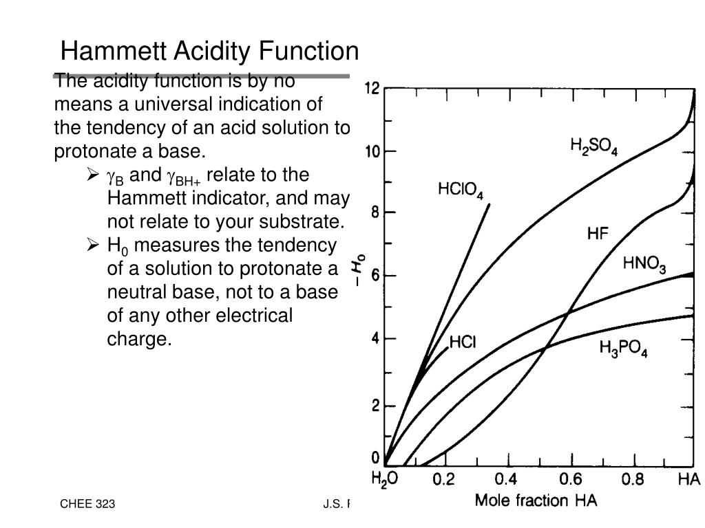 Hammett Acidity Function • The acidity function is by no means a universal indication of the tendency of an acid solution to protonate a base. • gB and gBH+ relate to the Hammett indicator, and may not relate to your substrate. • H0 measures the tendency of a solution to protonate a neutral base, not to a base of any other electrical charge. J.S. Parent